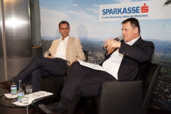 Bludenz am 28.8.2014-6610 LPS LH Markus Wallner beim Wirtschaftstalk in der Sparkasse Bludenz am Podium mit Christoph Thoma, Dir.