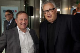 Bludenz am 28.8.2014 LPS LH Markus Wallner beim Wirtschaftstalk in der Sparkasse Bludenz am Podium mit Christoph Thoma, Dir.